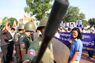 A police officer points his electric shock baton at a photographer during a protest in front of Wat Botum. Police blocked the demonstrators from approaching prime Minister Hun Sen's nearby mansion, Where they wanted to hand over a petition urging the premier to help resolve a number of land disputes.